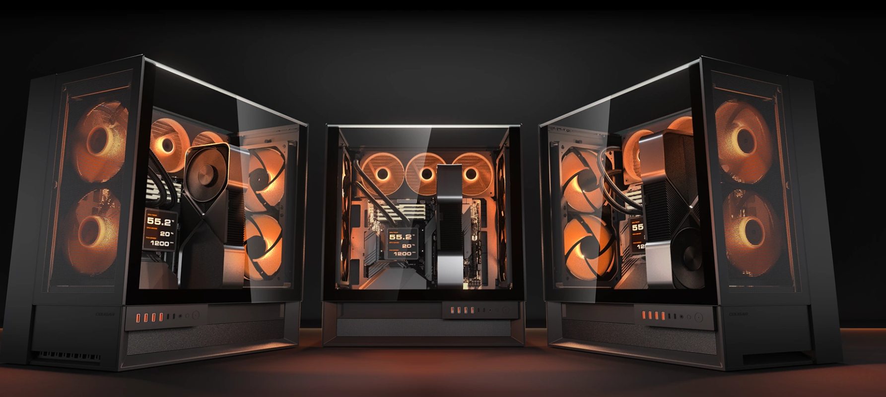La primera y única caja para PC del mercado con cuatro ventiladores PWM de 160 mm preinstalados , la OmnyX ofrece un flujo de aire superior desde el primer momento, con espacio para una capacidad total de 7 ventiladores. La alineación invertida de adelante hacia atrás crea un efecto de corriente de aire potente y natural , con dos ventiladores frontales que aspiran aire frío y dos traseros que expulsan aire caliente en una trayectoria directa e ininterrumpida. La distribución uniforme de los ventiladores con aspas invertidas y delanteras permite modos de entrada flexibles , creando un flujo de aire suave y direccionalmente consistente, independientemente de la orientación del equipo.