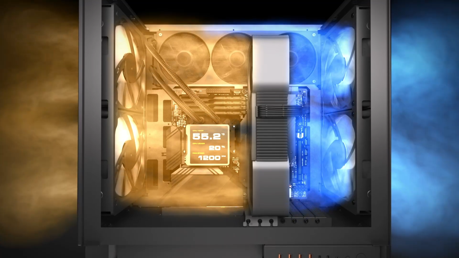 Al bloquear una capacidad absoluta de ventilador frontal y trasero reflejada, se maximiza el área de superficie de la GPU en contacto con un flujo de aire constante y máximo , independientemente de la orientación de la carcasa.