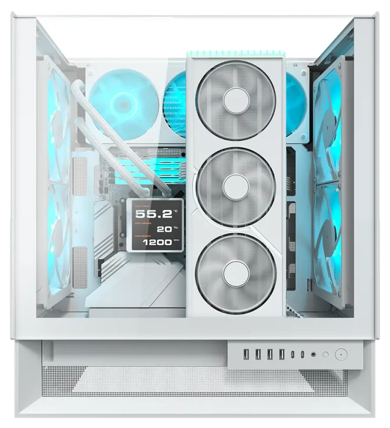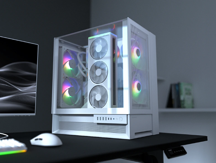 Su diseño perfectamente simétrico permite una total libertad de orientación. Con dos paneles de vidrio transparente que permiten visualizar tu equipo desde cualquier ángulo, el OmnyX luce espectacular, ya sea a la derecha, a la izquierda o al centro.