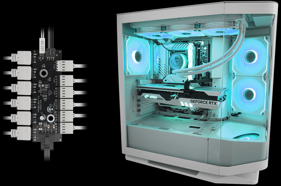 El FV270 RGB incorpora un concentrador de ventilador universal integrado que permite coordinar a la perfección la velocidad del ventilador PWM y la iluminación RGB. Esto permite controlar la iluminación RGB sin necesidad de software, o sincronizarla con el software de la placa base.