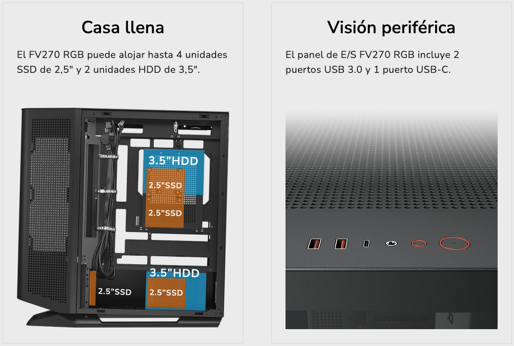 Con una amplia compatibilidad para placas base E-ATX de última generación y capacidad para GPUs de hasta 420 mm con soportes giratorios para opciones de orientación horizontal/vertical, el FV270 RGB está diseñado para los equipos de juego del futuro. Crea sin límites, construye sin restricciones y prepárate para la próxima generación de tecnología.