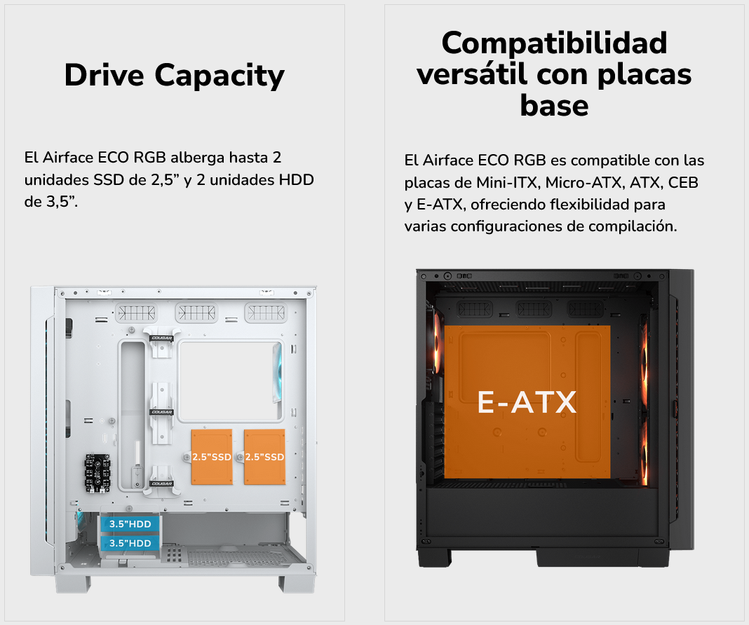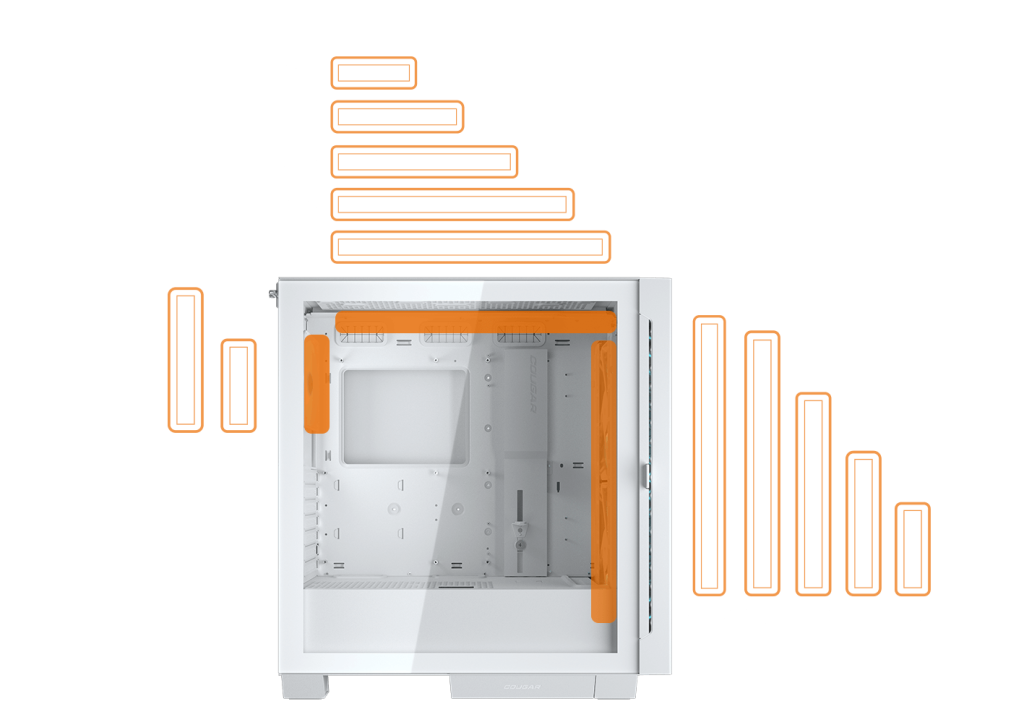 El Airface ECO RGB tiene capacidad máxima de 390mm, que se puede configurar tanto horizontal como verticalmente. En respuesta a la retroalimentación del usuario, el espacio vertical de GPU se ha actualizado para el Airface ECO RGB: esta mejora proporciona más espacio para el flujo de aire sin obstáculos alrededor de la GPU.