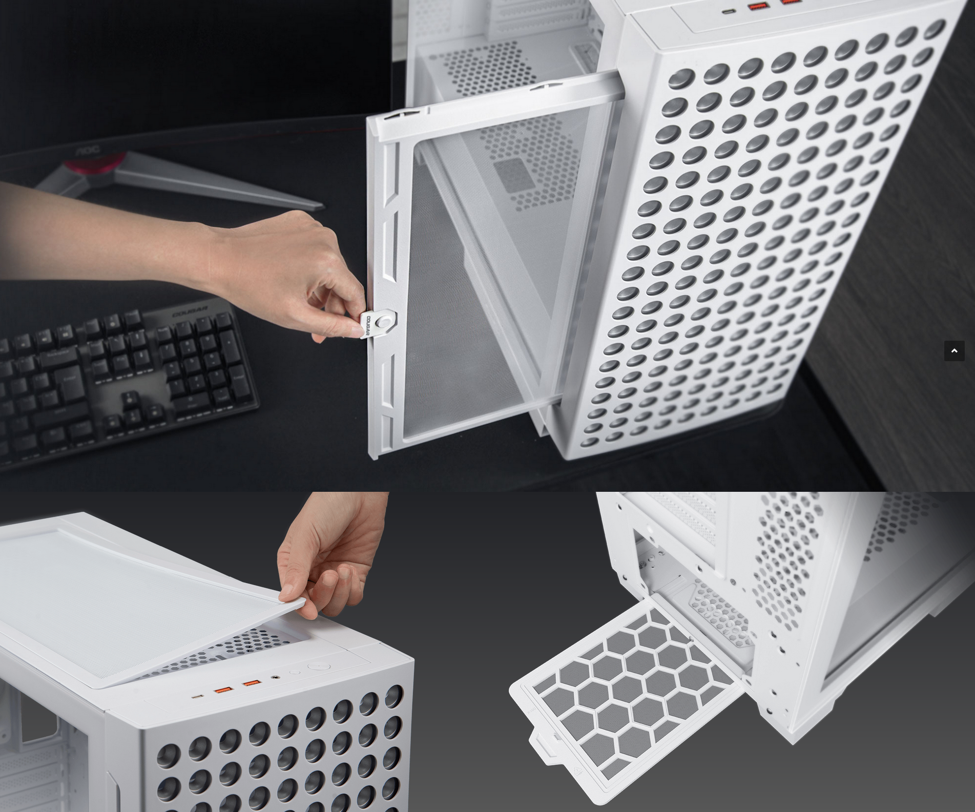 Los filtros en los tres lados ventilados, delantero, superior, inferior, evitan efectivamente la entrada de polvo, manteniendo sus componentes limpios. El filtro de polvo de la diapositivas delantera se retira sin quitar el panel frontal, haciendo que el mantenimiento sea una brisa, y la adición de una etiqueta de goma aumenta la facilidad de uso al proporcionar un mejor agarre en el filtro. El filtro lateral superior se adhiere magnéticamente mientras el filtro inferior se desliza para una fácil eliminación.
