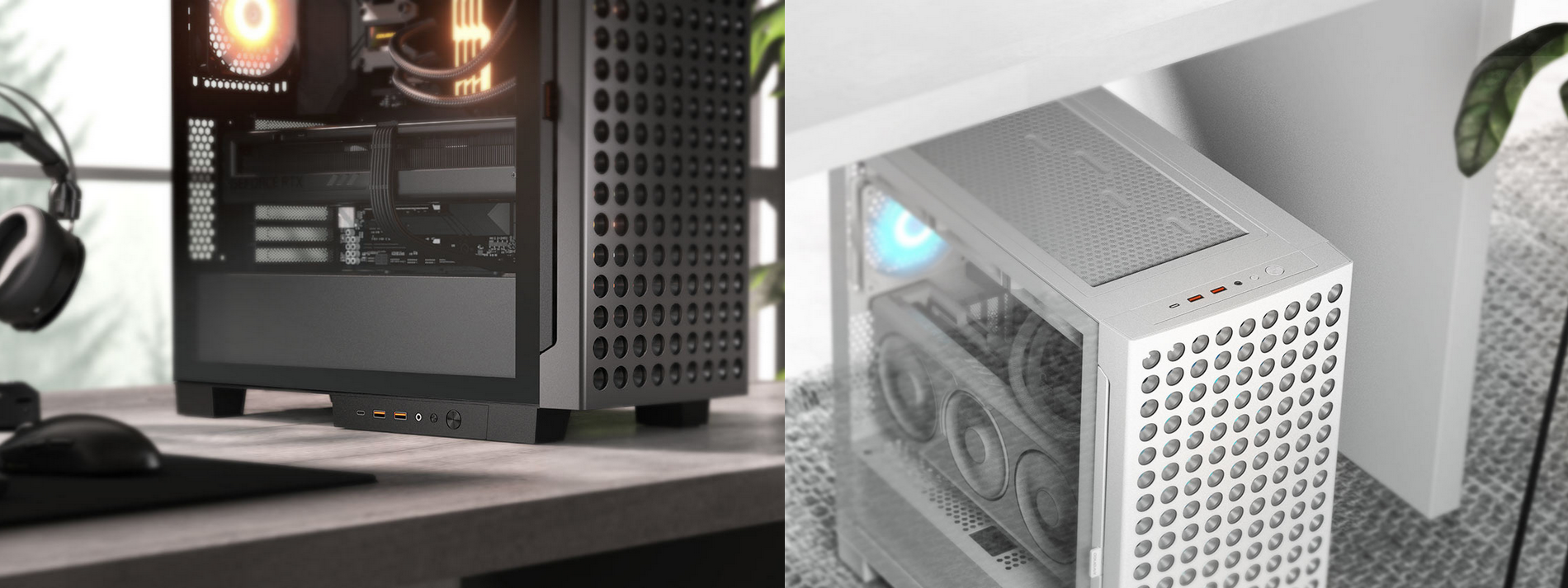 Ya sea que preficioe sus puertos y botones en la parte superior o inferior, esta característica le permite colocarlos donde sean más convenientes para usted. Esta adaptabilidad asegura que todas sus conexiones sean fácilmente accesibles, sin importar la forma en que oriente su caso. El panel de E/S de la AeroAface de la OCE incluye 2 x USB-C 3.2 Gen 2, 1 x puertos USB-A 3.0, 4 conector de auriculares, botón RGB.