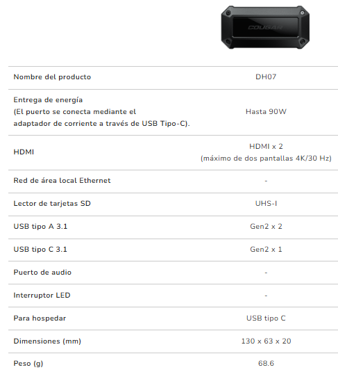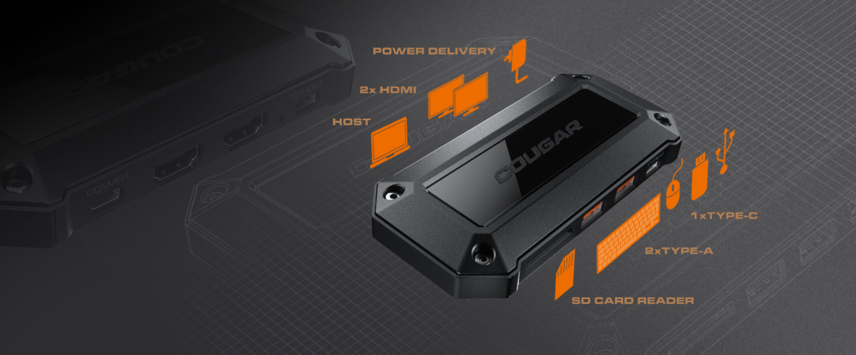 DH07 Hub de acoplamiento está diseñado para ser delgado y fácil para transportar. A diferencia de otros con una monótona carcasa de aluminio extruido, COUGAR DH07 mantiene la identidad de DS10 como carcasa robusta y superficie resistente a los arañazos.