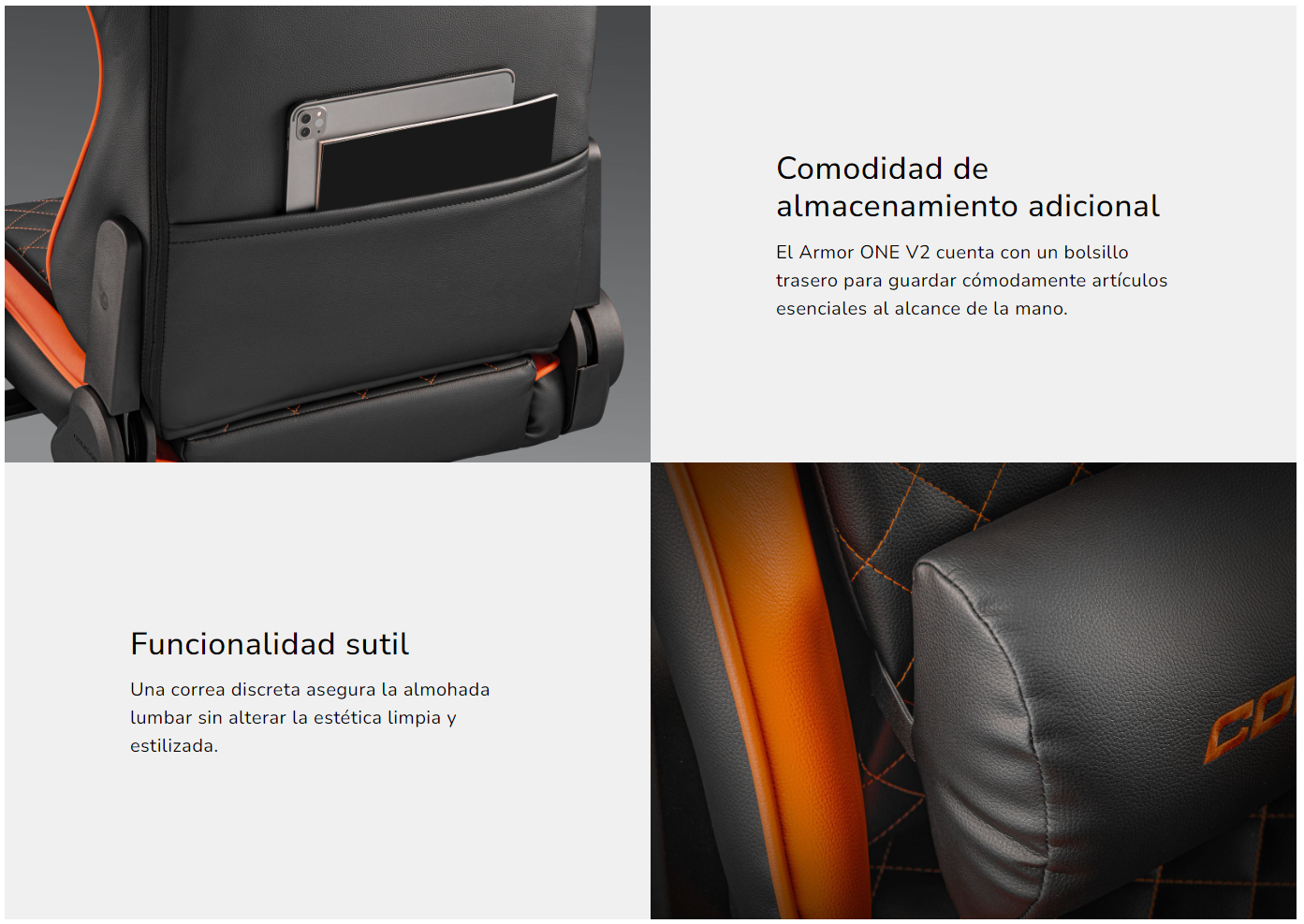 Armor ONE V2 conserva la estructura de respaldo alto de su predecesor, diseñada para brindar comodidad y apoyo a la zona lumbar.