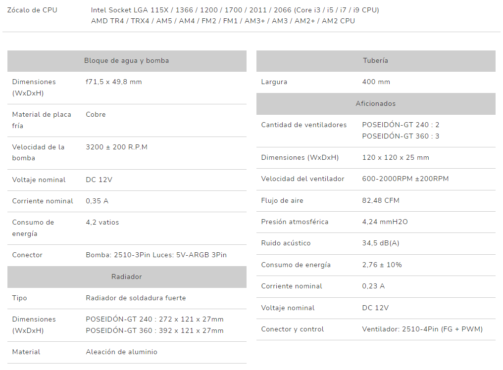 - Consumo eléctrico 4.2 W bomba, 2.76 W ± 10% ventiladores