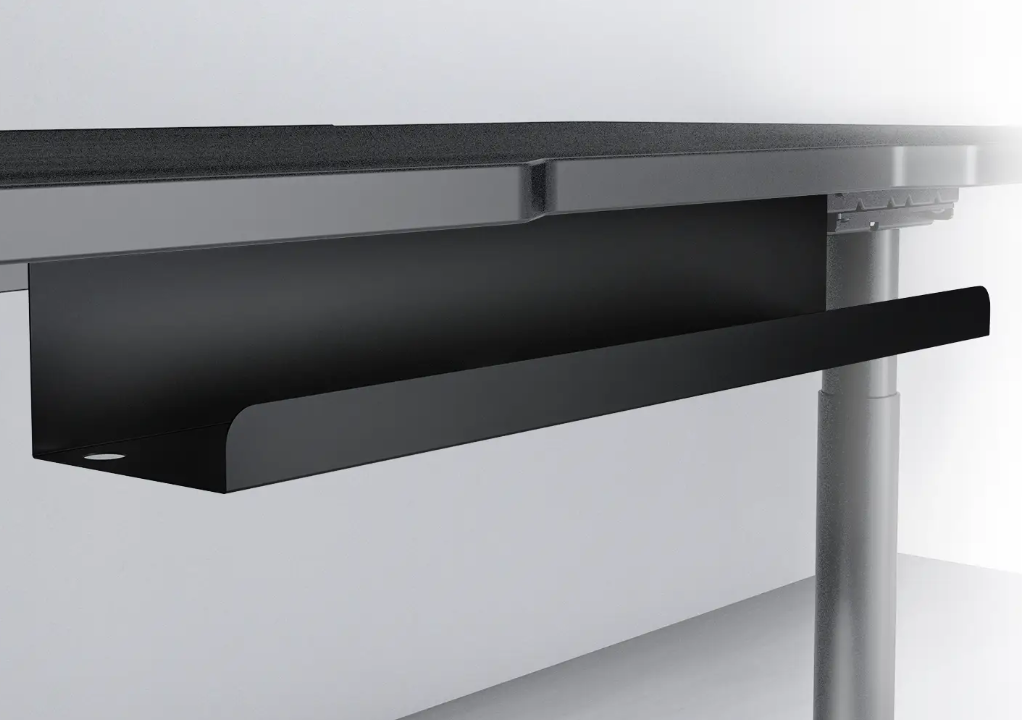 El estante y la cubierta para la gestión de cables están ocultos debajo del escritorio, lo que mantiene una estética ordenada al tiempo que proporciona un almacenamiento conveniente y organizado para los cables de sus dispositivos.