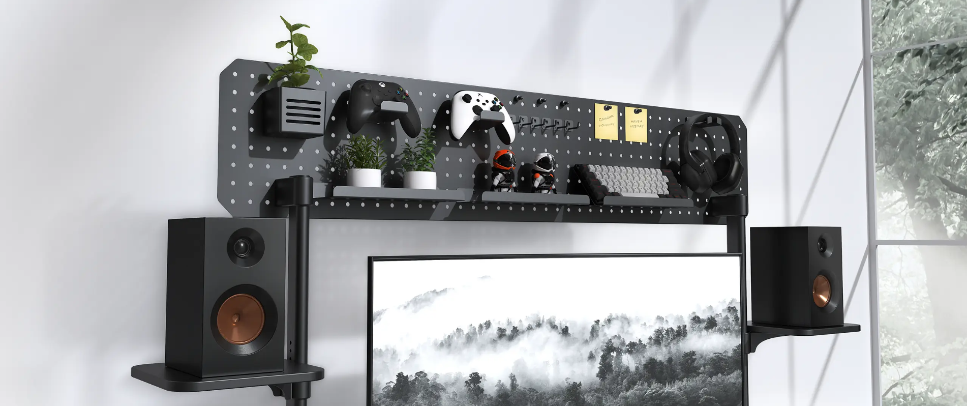 Los accesorios versátiles de E-Odyssey se pueden montar en el tablero perforado para maximizar el almacenamiento vertical en arreglos personalizados.