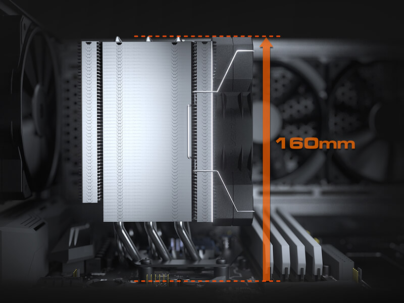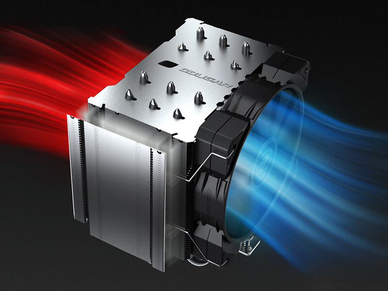 Para mejorar aún más la eficiencia de la disipación de calor, Forza 85 Essential fue diseñado con una forma de giro de 90 grados en ambos extremos de las aletas del disipador de calor. Este diseño de espacio cerrado crea un túnel de aire que cierra el flujo de aire de los lados del radiador y, a su vez, provoca una presión de aire diferente en ambos lados de Forza 85 Essential. Esta diferencia de presión de aire aumenta el flujo de aire a través de las aletas para maximizar la eficiencia de enfriamiento.