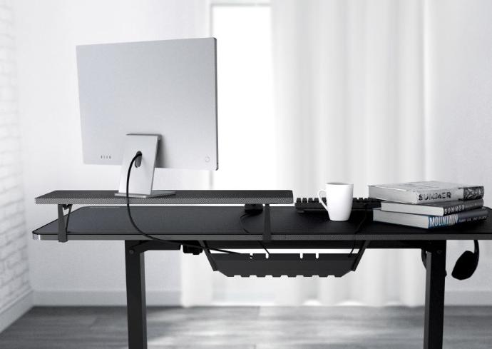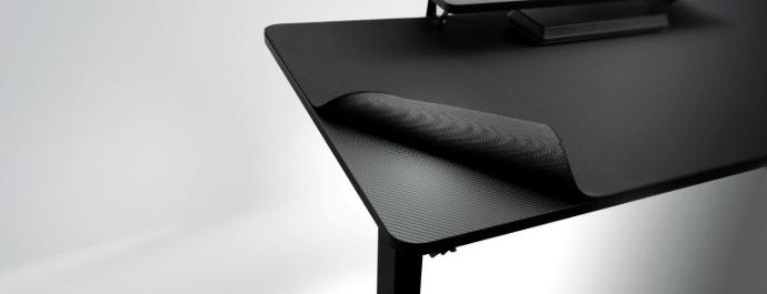 El laminado texturizado de fibra de carbono da a la superficie del escritorio un aspecto elegante y moderno.