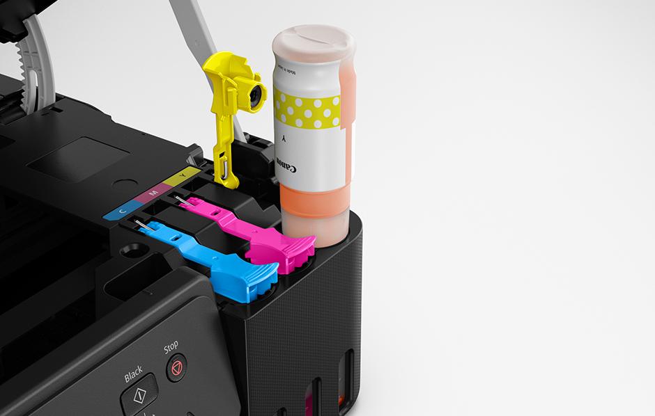 Los tanques de tinta integrados te permiten ver cuánta tinta queda. Rellenar los tanques es más fácil y sencillo ya que cada botella tiene una válvula que embona con cada tanque de color.