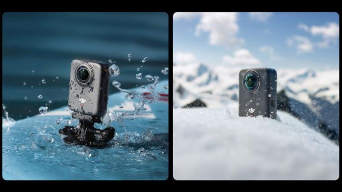 El cuerpo de la cámara Osmo 360 cuenta con clasificación de impermeabilidad IP68 y puede utilizarse a profundidades de hasta 10 metros. Incorpora una tapa para el compartimento de la batería y una tapa para el puerto USB-C que garantizan la impermeabilidad para tomas breves. Además, la cámara está diseñada para grabar hasta 1.5 horas en condiciones de frío extremo, hasta -20 °C, sin funda.