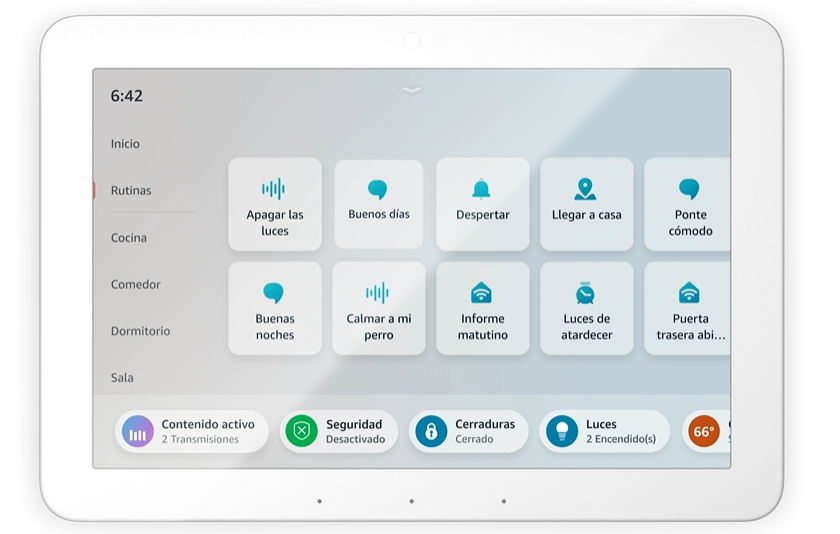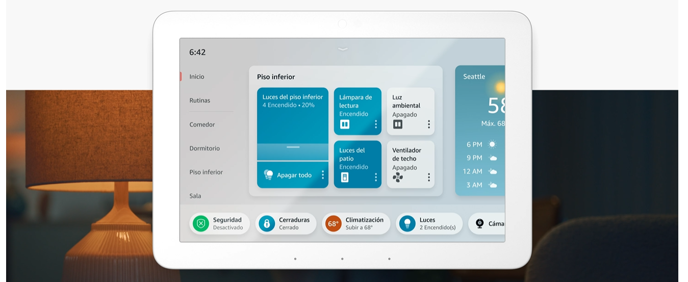 El Echo Hub es compatible con miles de cámaras, luces, cerraduras, enchufes, termostatos, parlantes y otros dispositivos conectados. Así, tendrás todos tus dispositivos inteligentes juntos en un solo hub.