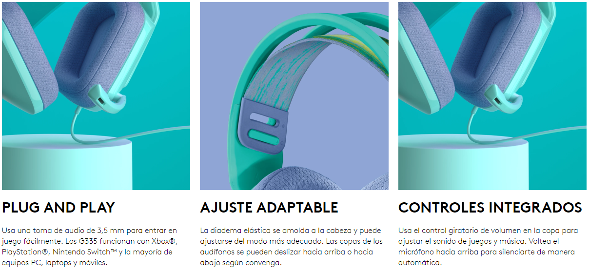 Ligeros y atractivos. En los G335 se combinan el color y el confort. El diseño de diadema con suspensión con cinta ajustable permite el ajuste idóneo. Con Plug and Play y controles integrados podrás conectarte y meterte de lleno en el juego rápidamente. Elige el color que vaya mejor con tu increíble estilo.