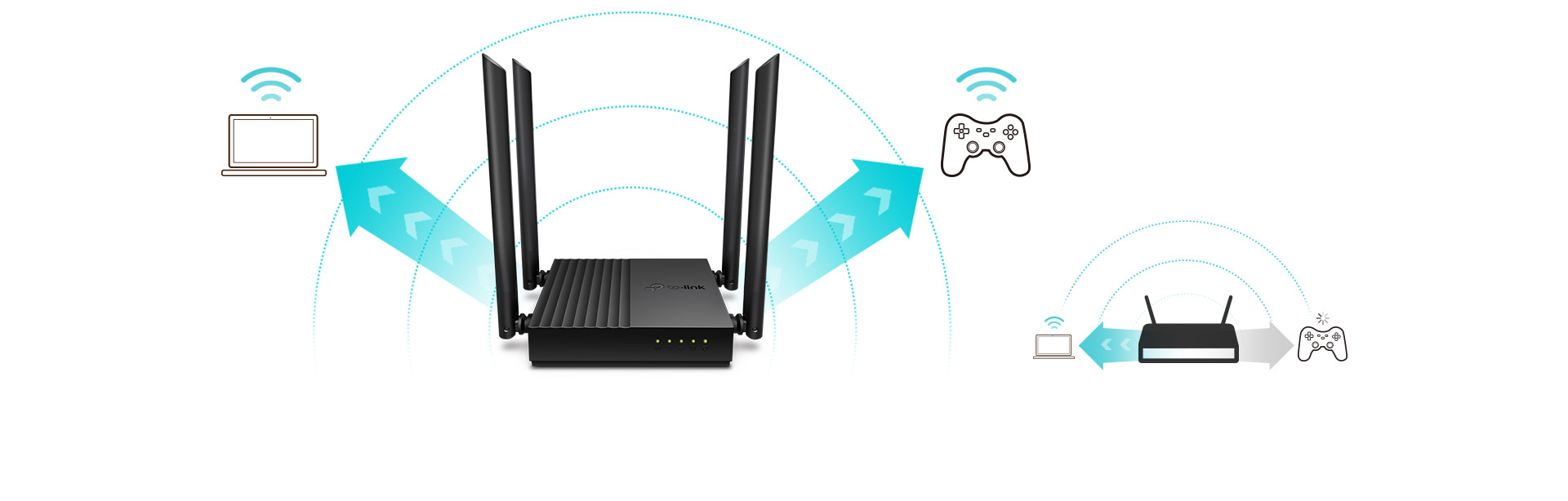 Con 4 antenas externas de alto rendimiento, Archer C64 aumenta las señales WiFi en toda su casa. La tecnología de formación de haces detecta los dispositivos y concentra la fuerza de la señal inalámbrica hacia ellos, especialmente para los puntos que antes eran difíciles de alcanzar.