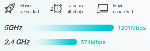 - Velocidad máxima: hasta 1201 Mbps (5 GHz) y 574 Mbps (2.4 GHz)