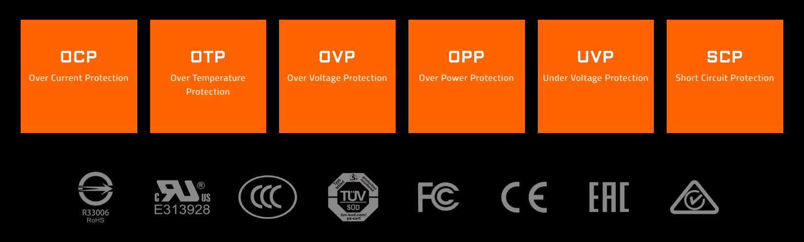 Para asegurarnos de que todo el sistema informático funciona de manera estable en cualquier condición, no solo agregamos diseños de protección como OCP, OTP, OVP, OPP, UVP y SCP, sino que también garantizamos el funcionamiento estable de su sistema a través de la certificación de seguridad de varios paises.