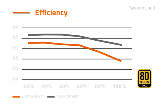 La certificación 80 Plus Gold garantiza ofrecer un 90% de eficiencia al 50% de carga. La mejor eficiencia energética supone menos desperdicio de energía, menos calor y menos ruido de ventilador.
