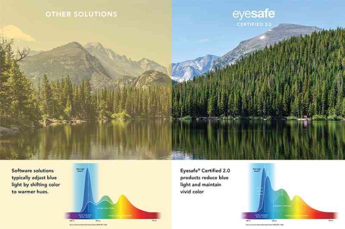 Otras soluciones ajustan la luz azul desplazándola color a más cálido tonos. La certificación 2.0 de Eyesafe® reduce el azul de alta energía ligero mientras manteniendo rendimiento del color.