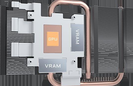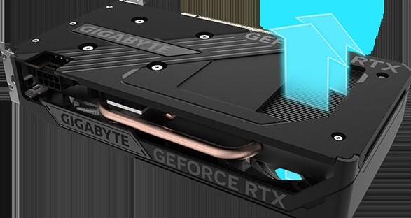 La placa de cobre contacta directamente con la GPU, junto con los tubos de calor de cobre compuesto, que transfieren rápidamente el calor de la GPU y la VRAM al disipador.