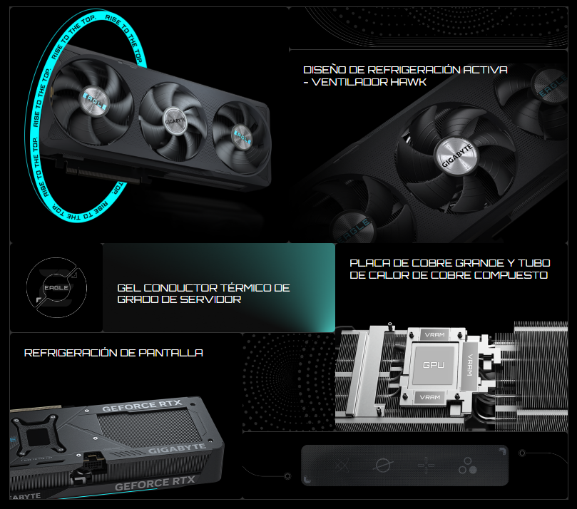 El sistema de refrigeración WINDFORCE ofrece un rendimiento térmico excepcional gracias a una combinación de tecnologías de vanguardia. Incorpora gel conductor térmico de grado servidor, innovadores ventiladores Hawk con giro alterno, tubos de calor de cobre compuesto, una gran placa de cobre, ventiladores activos 3D y refrigeración por pantalla.