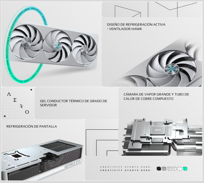 El sistema de refrigeración WINDFORCE ofrece un rendimiento térmico excepcional gracias a una combinación de tecnologías de vanguardia. Incorpora gel conductor térmico de grado servidor, innovadores ventiladores Hawk con giro alterno, tubos de calor de cobre compuesto, una gran cámara de vapor, ventiladores activos 3D y refrigeración por pantalla.