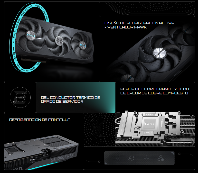 El sistema de refrigeración WINDFORCE ofrece un rendimiento térmico excepcional gracias a una combinación de tecnologías de vanguardia. Incorpora gel conductor térmico de grado servidor, innovadores ventiladores Hawk con giro alterno, tubos de calor de cobre compuesto, una gran placa de cobre, ventiladores activos 3D y refrigeración por pantalla.