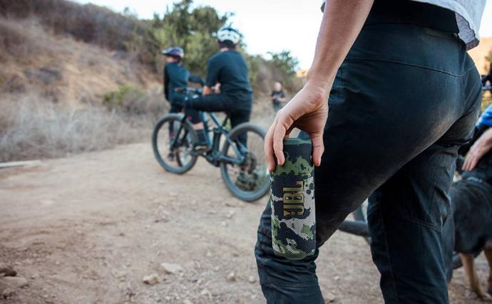 La rejilla del altavoz JBL Flip 7 incorpora un 77 % de plástico reciclado posconsumo y tejido 100 % reciclado. El embalaje es de papel con certificación FSC y tinta de soja.