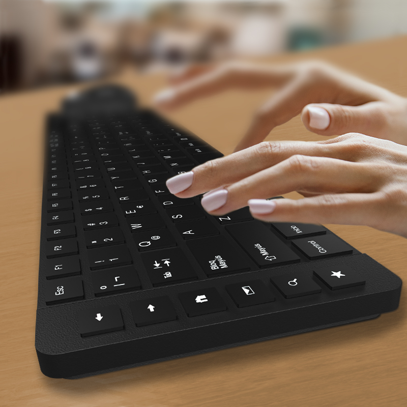Complementa tu computadora de escritorio o portátil con este combo de teclado y mouse elegante y moderno que ofrece precisión para llevar a cabo todas tus tareas. Aprovecha al máximo el espacio en el escritorio gracias a su diseño delgado y compacto. Supera tus expectativas y reduce el tiempo de trabajo con las 12 teclas multimedia de acceso directo a funciones, carpetas y aplicaciones que usas frecuentemente. El mouse inalámbrico de 4 botones cuenta con una forma ambidextra que te permite usarlo cómodamente con ambas manos. Simplemente conecta el nano receptor USB y estás listo para empezar a escribir y a navegar.