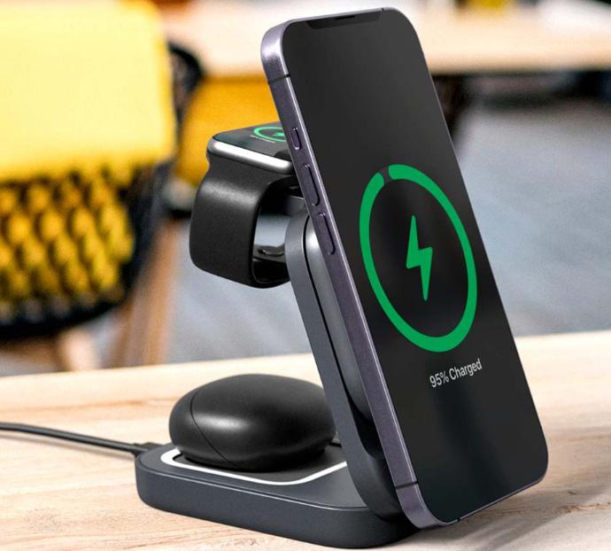 Estación de carga 3 en 1 para cargar simultáneamente tus dispositivos imprescindibles: Smartphones, AirPods®, Apple Watch®, lo que sea, todo cargándose a la vez, dondequiera que la vida te lleve.