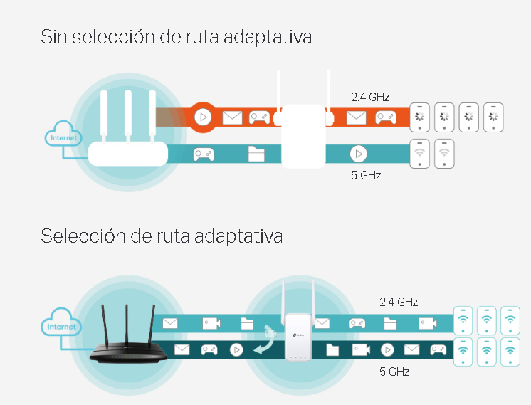 El repetidor Wi-Fi RE315 mantiene las conexiones a máxima velocidad al elegir de manera inteligente la mejor ruta y banda disponibles para llegar a cada dispositivo.