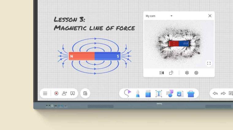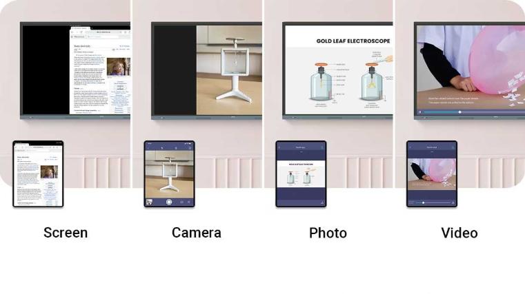 Haz más que transmitir tu pantalla. Compartir medios hace que las clases sean más dinámicas. Comparte fotos, videos o incluso la cámara en vivo de tu dispositivo directamente a la pantalla.