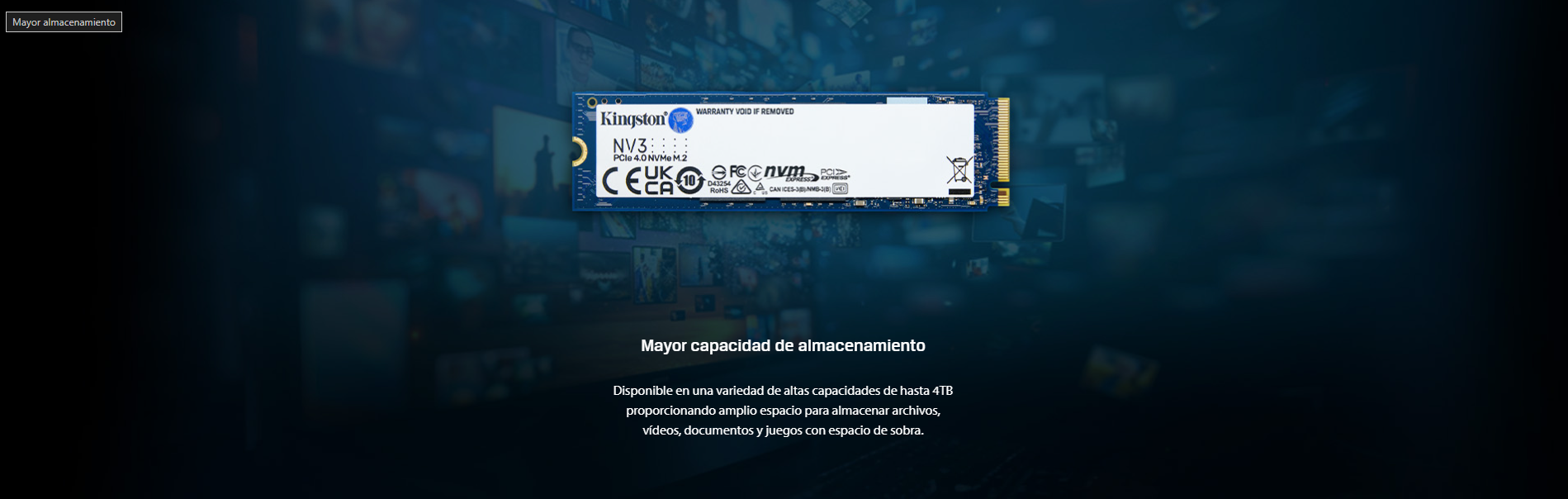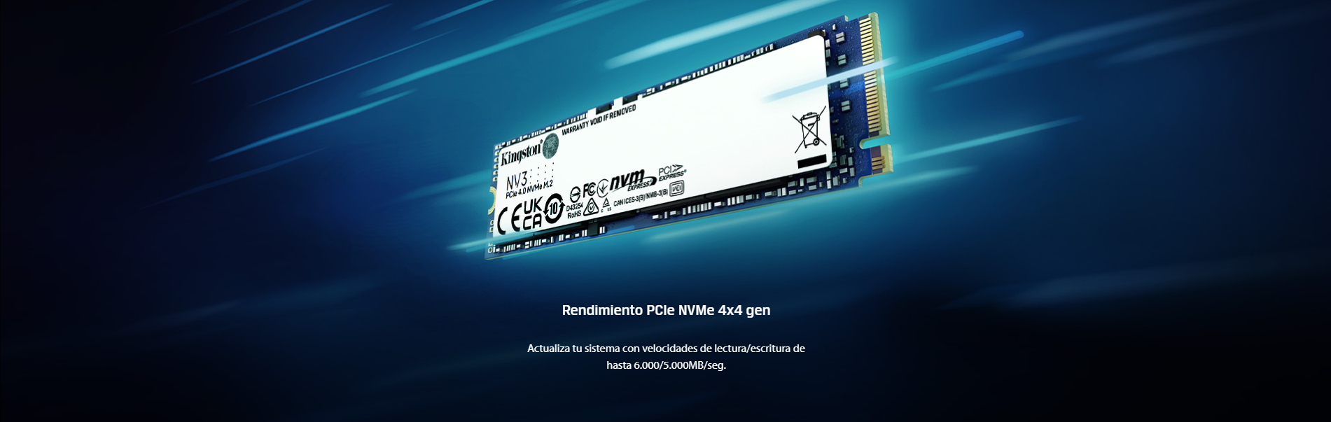Kingston’s NV3 PCIe 4.0 NVMe SSD es una solución de almacenamiento de última generación alimentada por un controlador NVMe 4x4 Gen, que ofrece velocidades de lectura/escritura de hasta 6.000/5.000MB/seg. Ofrece un menor consumo de energía y reduce el calor, optimizando el rendimiento de tu sistema sin comprometer el valor. El diseño compacto de una sola cara M.2 2280 (22x80 mm) amplía el almacenamiento hasta 4 TB conservando espacio para otros componentes. Vive las velocidades de NVMe con NV3.