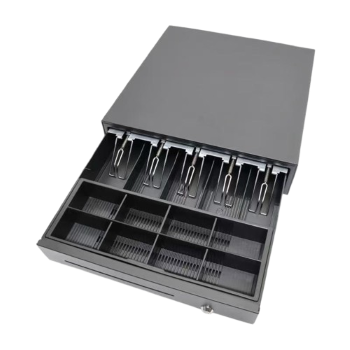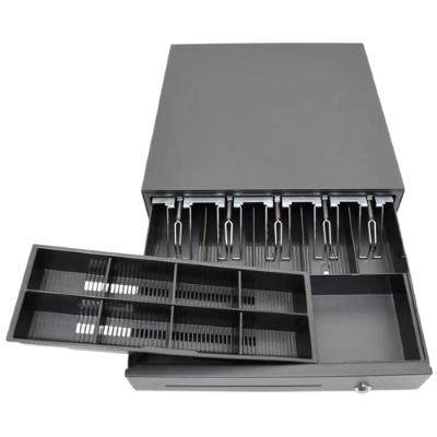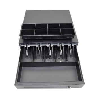 El VT-POS-405 de Business Solutions es un cajón de efectivo robusto, ideal para puntos de venta minoristas con 5 compartimentos para billetes y 8 para monedas ajustables.