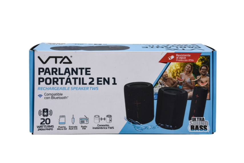 Diviértete y disfruta al máximo la música con el espectacular Parlante 2 en 1 Super Bass VTA-82493 de 20 Watts, práctico para utilizarlo como un solo parlante que divide el sonido en 2 ambientes (estéreo) o como 2 parlantes totalmente independientes desactivando la función TWS. Ideal para llevar a todas partes gracias a su versatilidad y gran sonido. ¡Aprovecha ahora y cómpralo aquí!